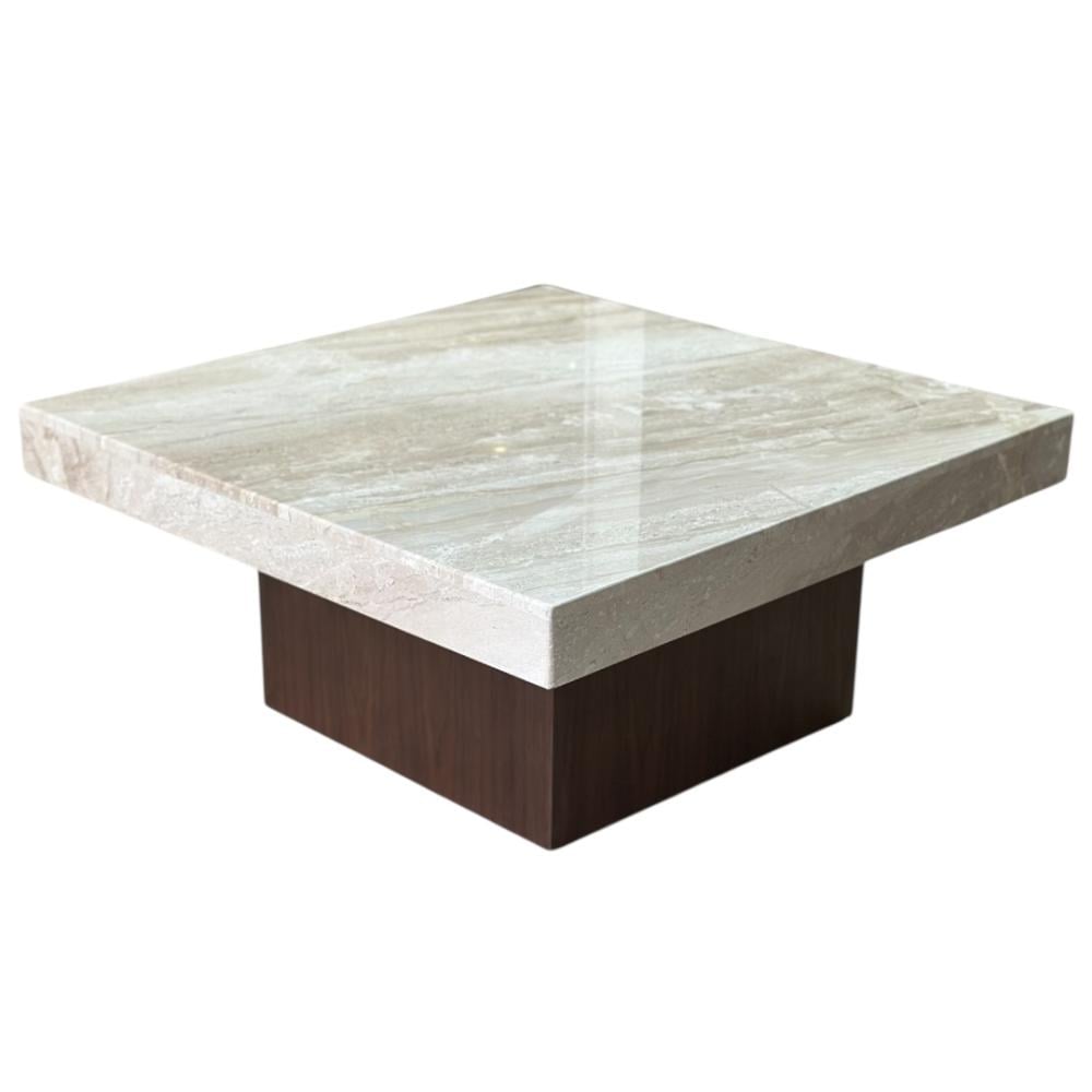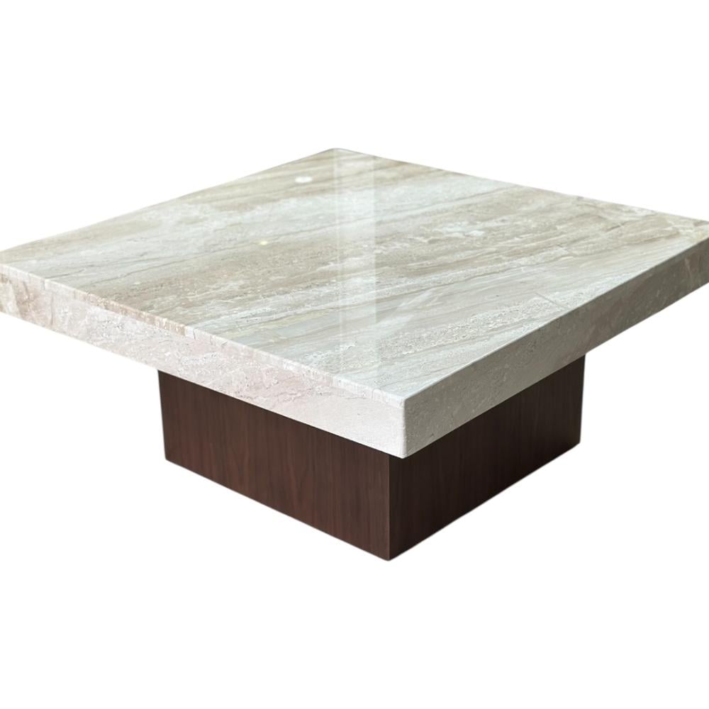 التصميم المربع العصري يرتكز على قاعدة خشبية مصمتة بلون بني داكن، تضيف طابعًا من الفخامة والصلابة في آنٍ واحد، لتكون الطاولة قطعة محورية في أي غرفة.