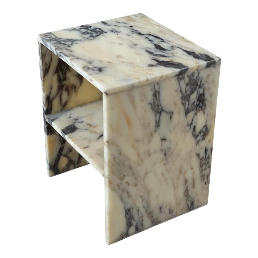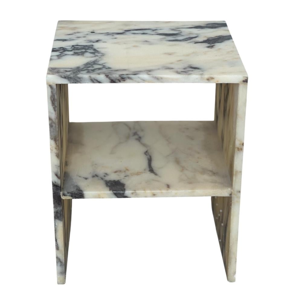 طاولة جانبية مربعة الشكل بأبعاد مثالية، تأتي بطبقتين من نفس الرخام الطبيعي – سطح علوي ورف سفلي – بتصميم متناسق يضفي لمسة راقية لأي مساحة، سواء بجانب السرير أو كنهاية أريكة في غرف الجلوس.